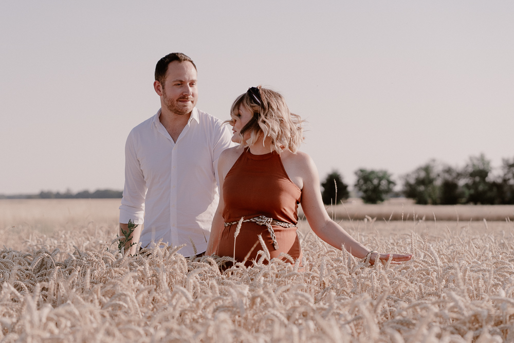 Une jolie fin de journée ensoleillée au beau milieu d’un champ de blés ! Un décor superbe pour une séance photo afin d’immortaliser le ventre rond de Marie.